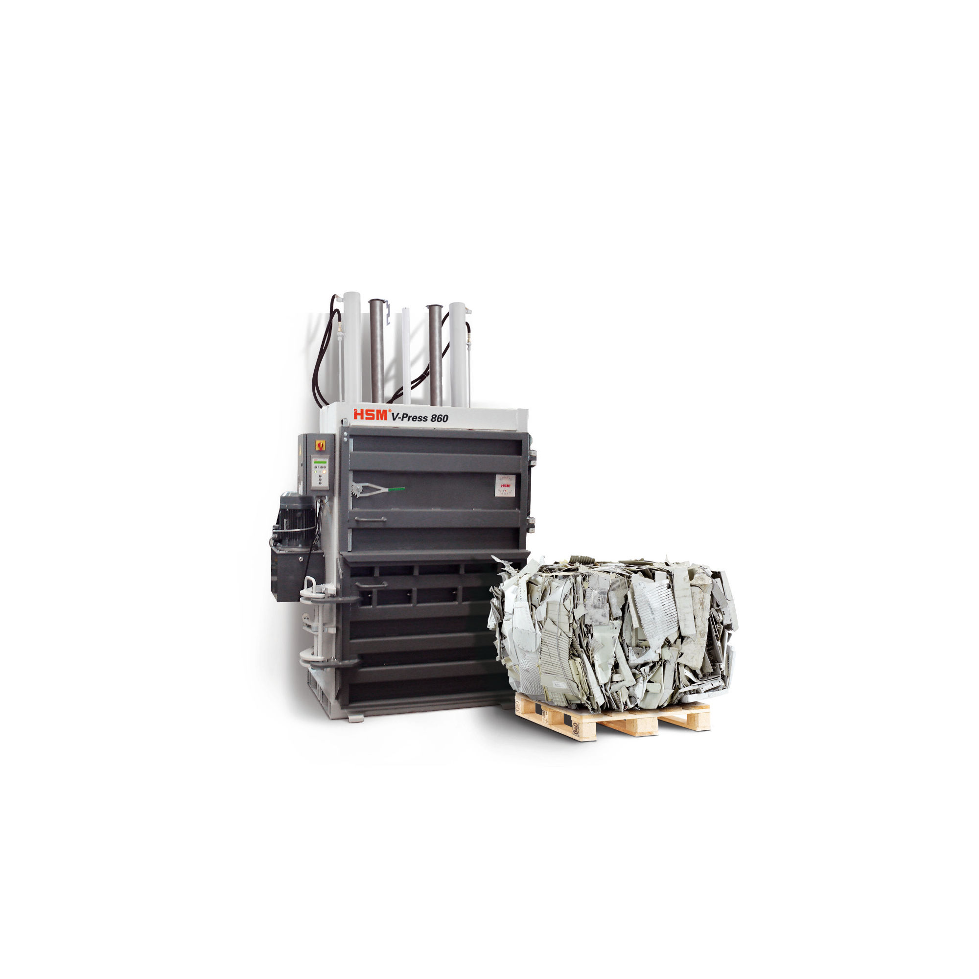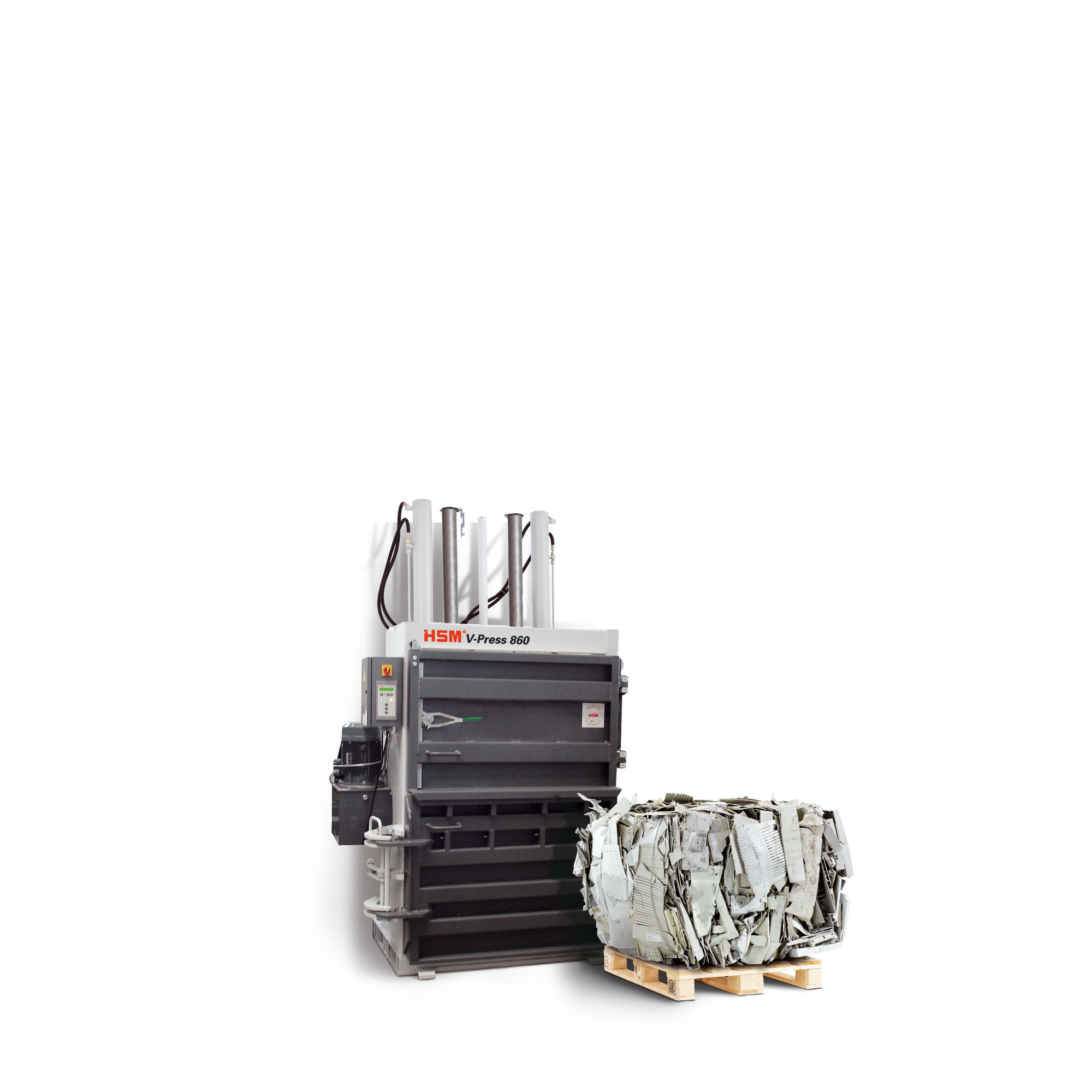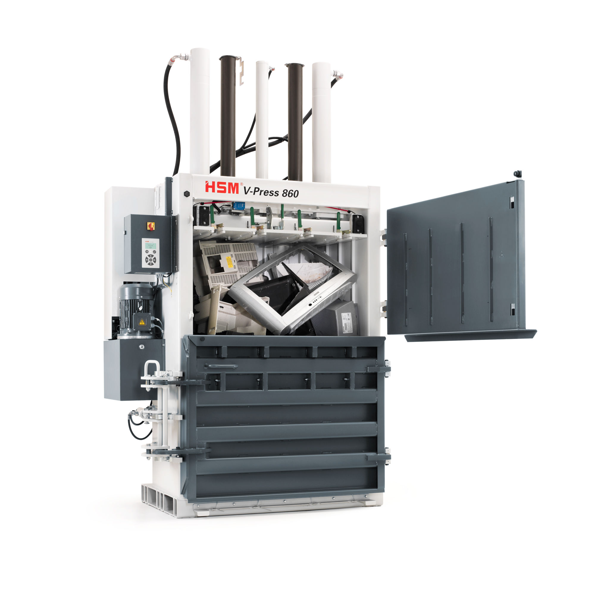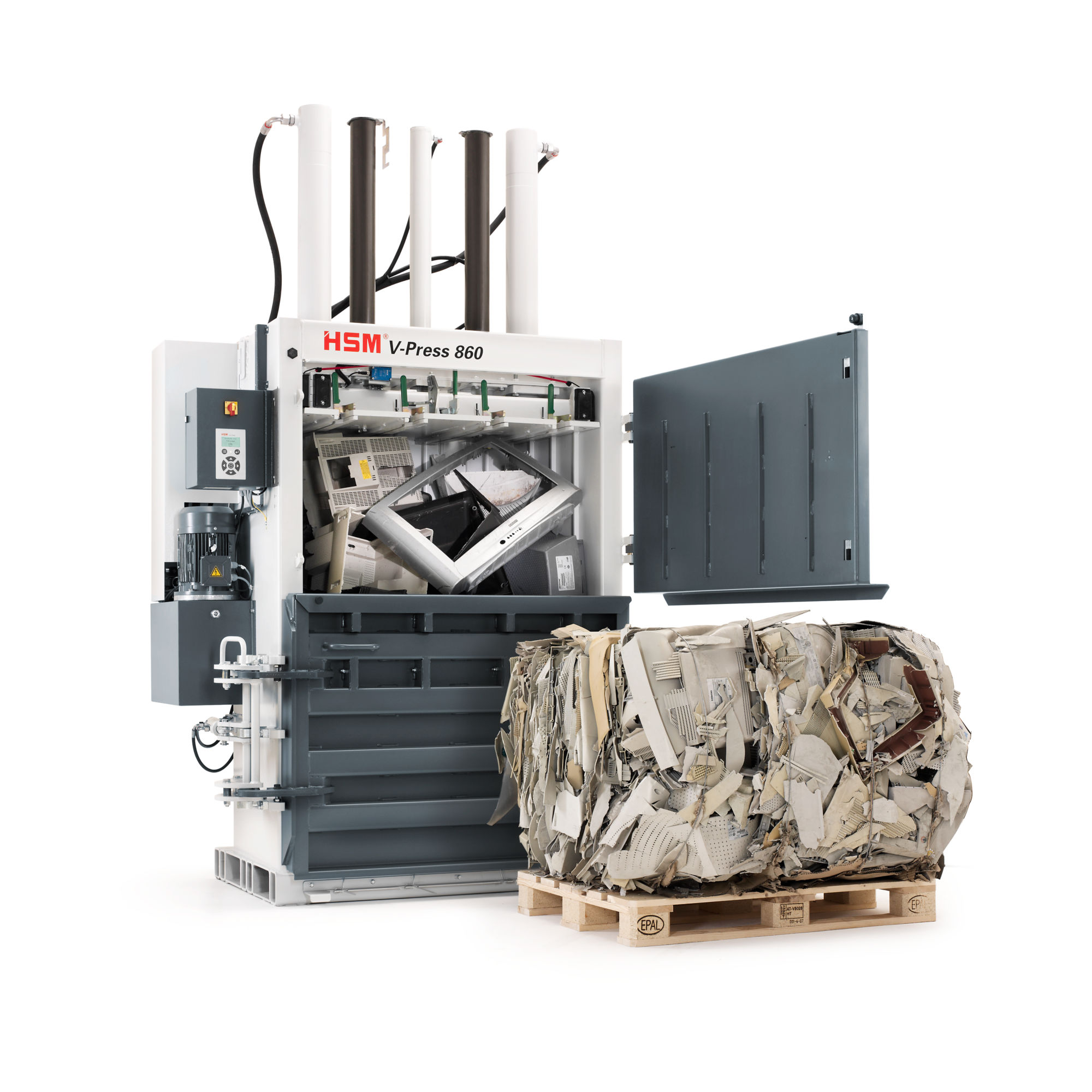 HSM V-Press 860 S modeli sert plastik (örn: monitör ve TV kasası) ve genişleyen plastik filmin hacmini azaltmak için en mükemmel seçimdir (diğer materyal isteğe bağlıdır).